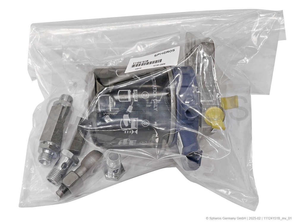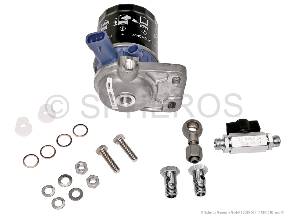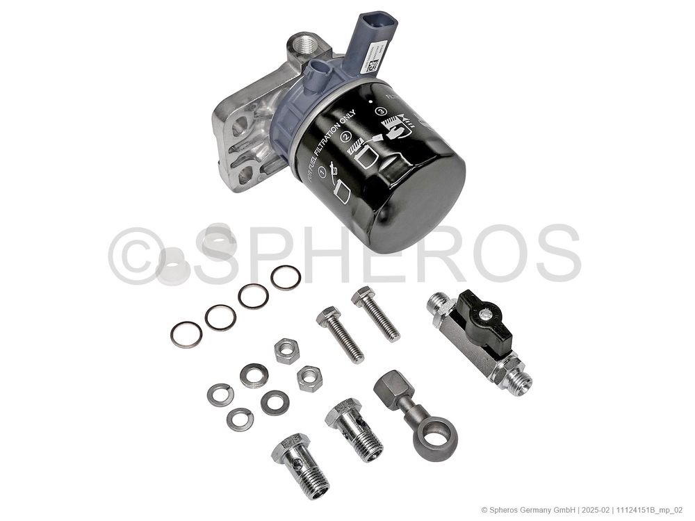 Contents: 1x 11146618_ Fuel filter with heating element 24 V 1x 88028_ low-pressure ball valve 2x 150762_ hollow screw M14x1.5 4x 151203_ sealing ring A14x18 2x 218065_ hexagon screw M8x30 2x 15327_ disc B8.4 2x 11118991_ spring lockwasher A8 2x 1303818_ hex nut M8x8 1x 89615_ banjo bolt M14x1.5 2x protective cap 2x packaging / flat bag PE